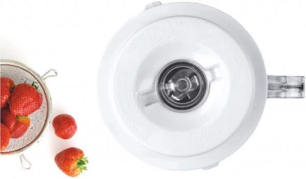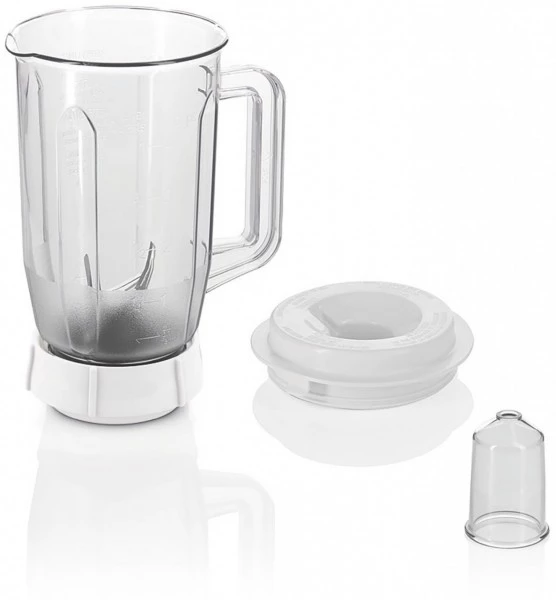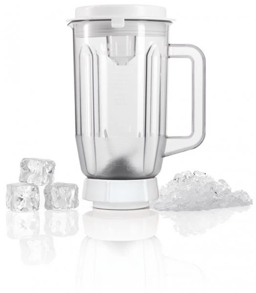 Nutzbares Fassungsvermögen max. 1 Liter, Material: besonders schlagfester Kunststoff, Mixer-Becher mit Skalierung, Deckel mit Einfülltrichter, auch zum Zerkleinern von Eiswürfeln und gefrorenem Obst und Gemüse geeignet, Maße (HxBxT): 23,5 x 13 x 13 cm.