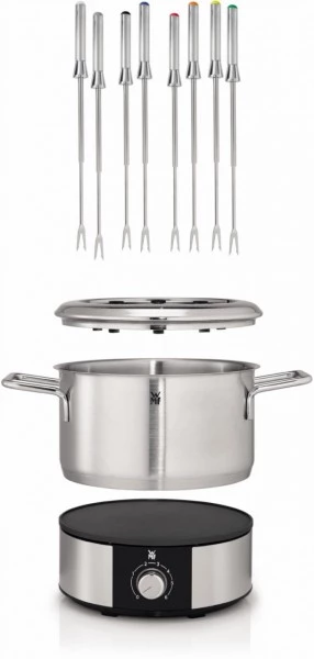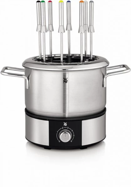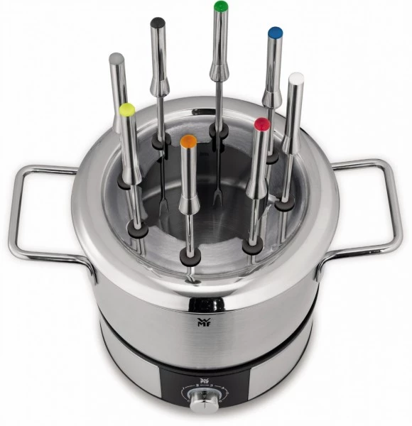 Im Lieferumfang des WMF Lono Fondue befinden sich acht Fondue-Gabeln. Diese unterscheiden sich durch Farbmarkierungen, sodass sie nicht verwechselt werden können. Auch das leidige Verhaken der Fondue-Spiesse hat WMF mit dem Lono Fonduetopf elegant gelöst: Jede Fonduegabel hat eine eigene Abstellposition im Topfeinsatz. Der Fonduetopf ist für alle Kochfeldarten geeignet, kann also zum Beispiel auch auf einem Induktionsherd verwendet werden und ist zudem spülmaschinengeeignet.