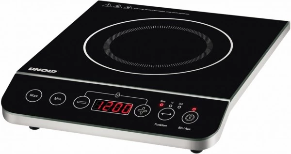 Davon schwärmen die Profis! Jetzt wird der Traum auch für Hobbyköche war: Kochen ohne Abwärme und Nachhitze. Und das Beste: Für die neue Induktionskochplatte von UNOLD® ist auch in der kleinsten Küche Platz. Energiesparendes, komfortables und blitzschnelles Kochen – einfacher geht’s nicht. Über ein elegantes Touchpad-Bedienfeld, das zur besseren Lesbarkeit abgeflacht ist, werden Temperatur und Timer eingestellt. Das bis zu 2.000 Watt starke Kochfeld ist in sechs Leistungsstufen regelbar. Der Timer ist bis auf 180 Minuten einstellbar; darüber hinaus gibt es 10 Temperaturstufen, von 60° C bis 240° C. Die 3-fach Sicherheitsfunktion passt das Gerät an Änderungen der Stromspannung an, schaltet die Platten nach spätestens zwei Stunden von alleine ab und erkennt selbständig für Induktion ungeeignete Töpfe. Überhitzungsschutz und Kindersicherung sind serienmäßig vorhanden.