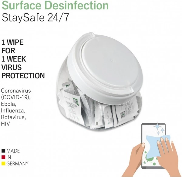 Die StaySafe 24/7 Oberflächen Desinfektionstücher neutralisieren Krankheitserreger wie z.B. Bakterien, Viren und Pilze und tragen dadurch zur persönlichen Hygiene und zum Eigenschutz vor Infektionen bei. “