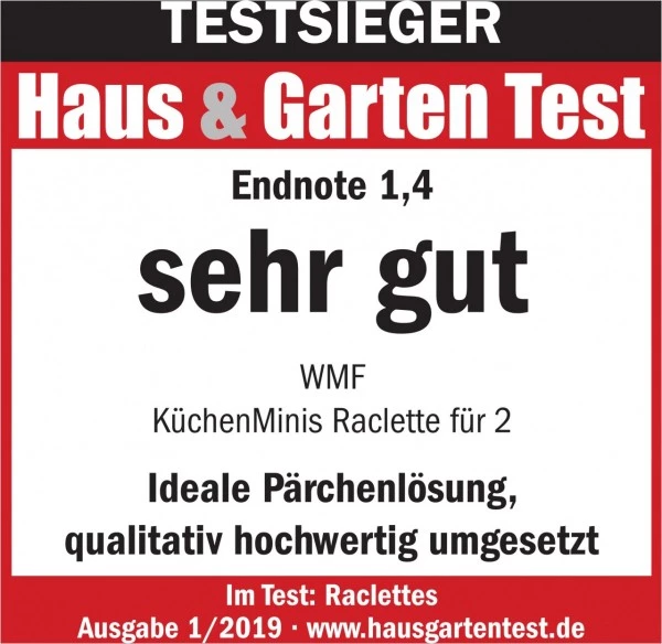 Mit dem WMF Küchenminis Raclette für Zwei verbindet Qualitätshersteller WMF zwei Dinge miteinander, die unbedingt zusammengehören sollten: Romantik und Raclette. Der WMF Raclettegrill für Zwei mit seiner Leistung von 370 Watt eignet sich entweder für ein romantisches „Dinner For Two“ oder den schnellen Raclette-Genuss zwischendurch. Im Lieferumfang enthalten sind neben dem Raclette Grill zwei kleine antihaftbeschichtete Pfännchen und zwei Raclette Schieber. Zudem ist noch ein besonders großes Pfännchen mit dabei, um damit größere Zutaten wie Spiegeleier, Spargel oder Toast Hawaii zu genießen.