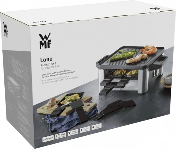 Raclette ist eines der beliebtesten Gerichte für gesellige Runden, egal ob mit Freunden oder im Kreise der Familie. Mit dem WMF Lono Raclette für vier Personen erhalten Sie einen Raclette-Grill aus hochwertigem WMF-Cromargan mit 870 Watt Leistung. Mit dabei sind vier hochwertige Raclette-Schieber sowie vier antihaftbeschichtete Pfännchen, alles natürlich spülmaschinengeeignet. Die Temperatur lässt sich über einen Drehregler variabel einstellen, die zugehörige LED-Beleuchtung macht den WMF Lono Raclettegrill für 4 Personen zum edel anmutenden Designobjekt.