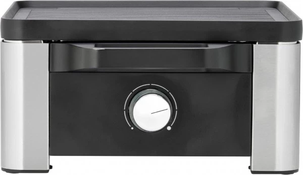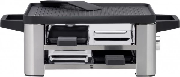 Mit dem WMF Raclettegrill für Vier nehmen insgesamt vier Personen am geselligen Raclette-Essen teil. Mit dem Gerät lässt sich aber nicht nur Käse in Pfännchen schmelzen: eine antihaftbeschichtete Wendegussplatte mit flacher sowie gerippter Oberfläche lädt zum gesunden Grillen von Fleisch, Fisch, Gemüse und Obst ein. Die Wendegussplatte ist natürlich ebenfalls spülmaschinengeeignet und dient zudem als praktische Ablage für heiße Raclette-Pfännchen.
