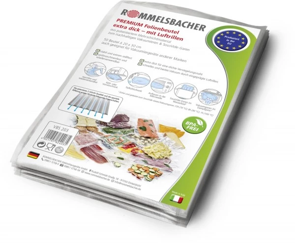 Die Verwendung von Original Rommelsbacher MagicVac® Folien garantiert eine einwandfreie und schnelle Vakuumierung mit den Rommelsbacher Vakuumiergeräten. Die patentierte 2-Schicht Qualität sowie die spezielle Riffelung sorgen für beste Vakuumier-Eigenschaften. In den Beuteln lassen sich Lebensmittel platzsparend und sicher vor Gefrierbrand im Tiefkühler lagern und anschließend in der Mikrowelle erwärmen. Sie sind hitzebeständig bis 100°C, so dass darin Lebensmittel im heißen Wasserbad erhitzt werden können. Selbst für das immer populärer werdende Sous-Vide Garen (Vakuumgaren bei Niedrigtemperatur) sind diese speziellen Beutel bestens geeignet. Die robuste Qualität macht eine umweltfreundliche Mehrfachverwendung möglich: einfach gut ausspülen und immer wieder verwenden. Neben Lebensmitteln lassen sich in den Folien aber auch andere Dinge geschützt lagern: Vakuum schützt Schmuck vor dem Anlaufen, bewahrt empfindliche Dinge (z. B. Verbandsmaterial oder Camping-Vorräte) vor Feuchtigkeit und Schmutz. Bestes Material für optimale Vakuumier-Ergebnisse!